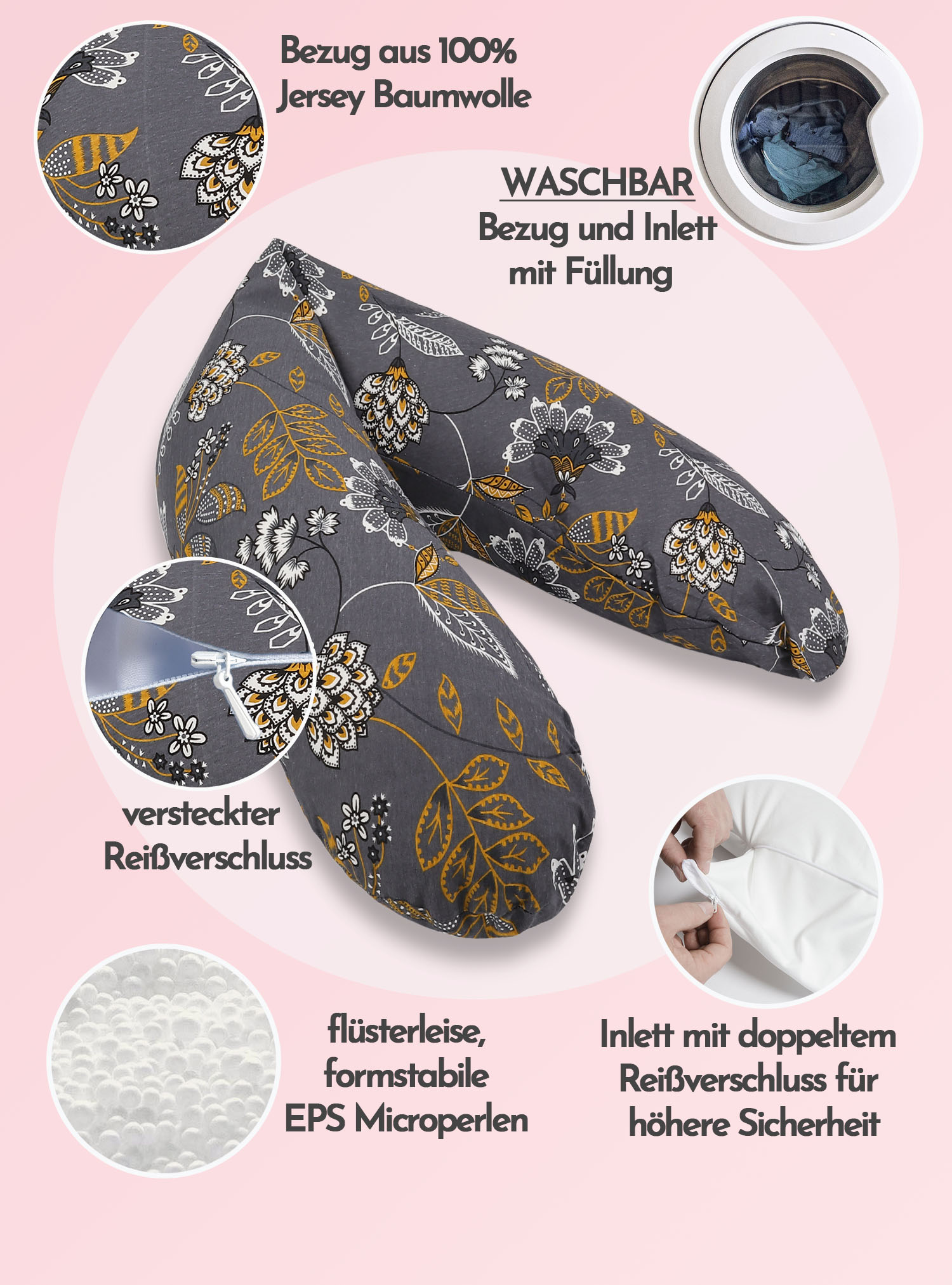 Das Inlett ist mit einem Reißverschluss versehen, sodass die Menge der Füllung individuell angepasst und der Bezug problemlos gewaschen werden kann. So kann eine möglichst lange Nutzungsdauer bei entsprechender Pflege garantiert werden und das Kissen vielleicht auch noch dem nächsten Kind eine Unterstützung in der ersten Lebensphase sein.