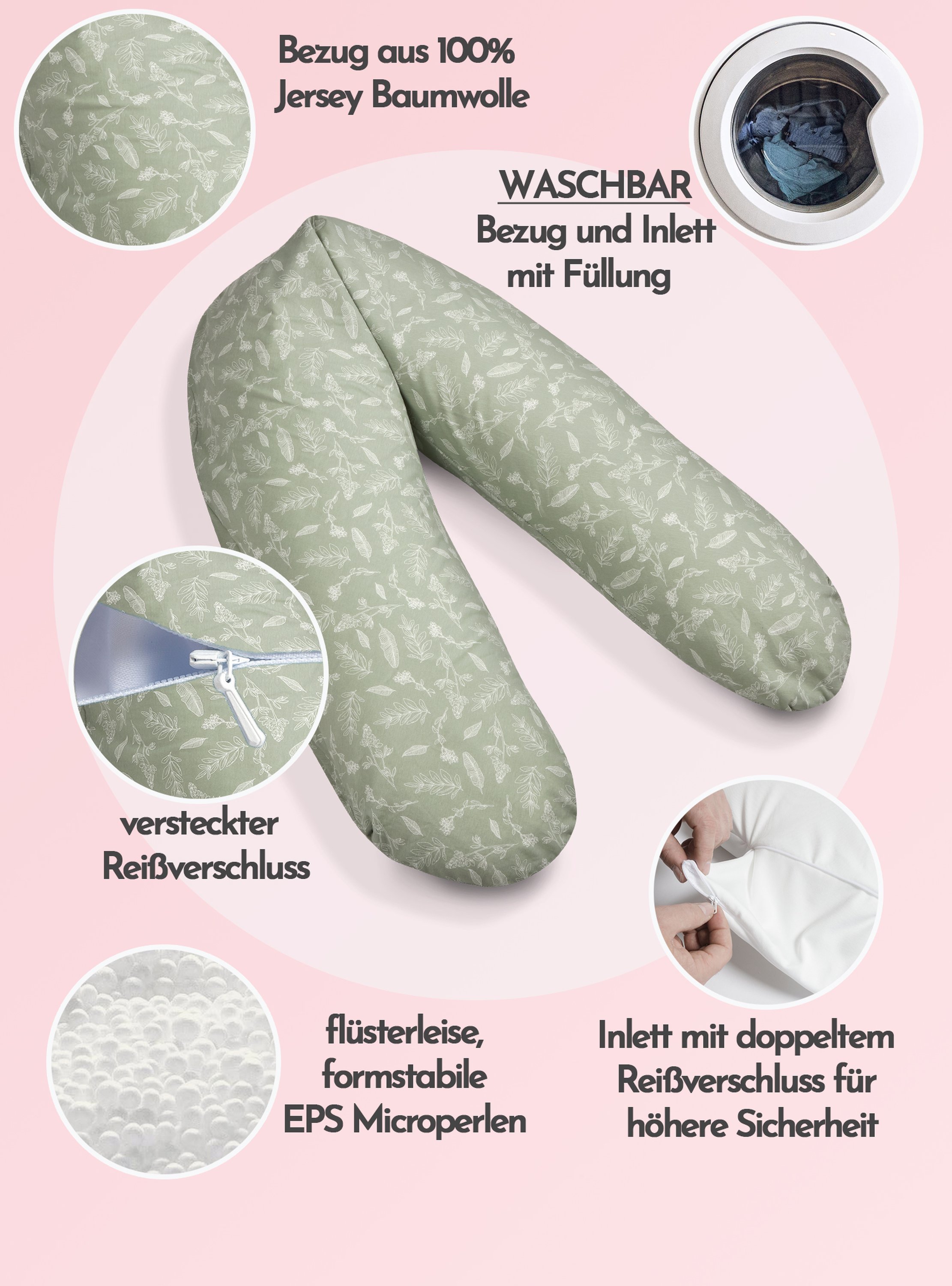 Das Inlett ist mit einem Reißverschluss versehen, sodass die Menge der Füllung individuell angepasst und der Bezug problemlos gewaschen werden kann. So kann eine möglichst lange Nutzungsdauer bei entsprechender Pflege garantiert werden und das Kissen vielleicht auch noch dem nächsten Kind eine Unterstützung in der ersten Lebensphase sein.