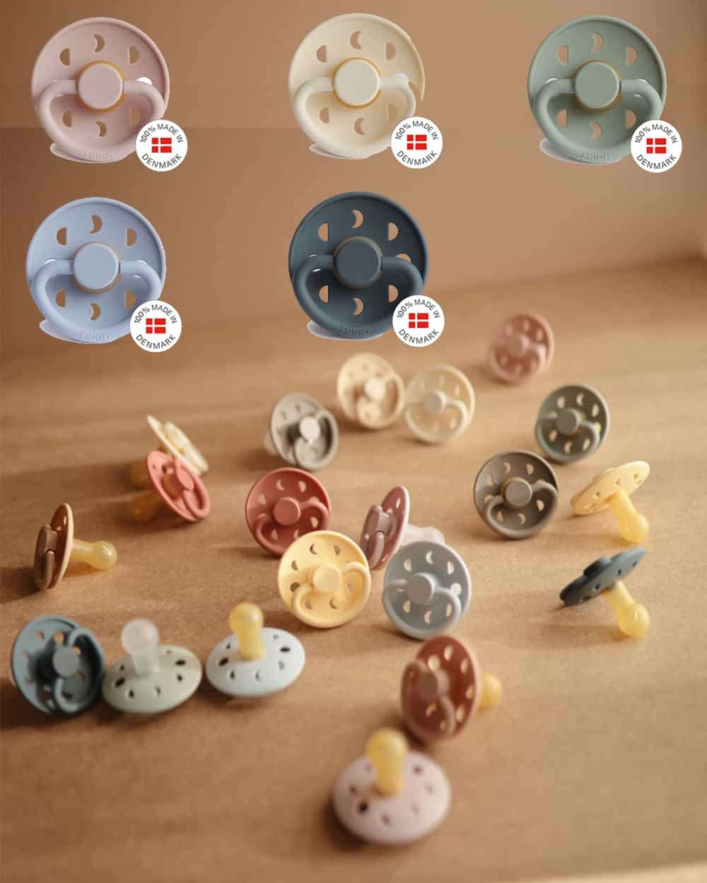 FRIGG Moon Phase ist ein Schnuller, welcher vom bewegenden Mond inspiriert ist. Die wechselnden Mondphasen spiegeln sich auf dem Kirschsauger Schild wider und fungieren als Luftlöcher, um die empfindliche Haut Deines Babys zu belüften und zu schützen. Die Mondphasen Inspiration setzt sich an dem halbmondfümigen Griff des Saugers fort.