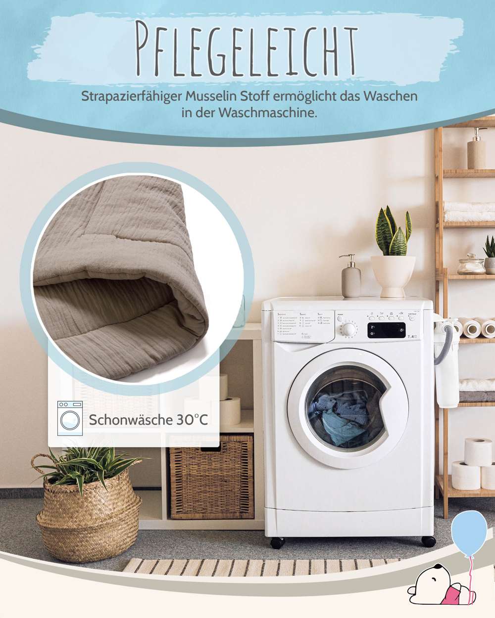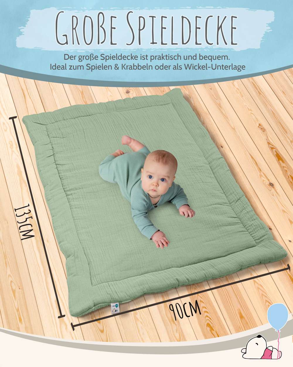 Hergestellt aus 100% Musselin-Baumwolle, bietet diese Decke nicht nur eine luxuriös weiche Oberfläche, sondern auch den perfekten Schutz für die empfindliche Haut der Kinder. Die zusätzliche Polsterung aus 100% Polyestervlies stellt sicher, dass jedes kleine Abenteuer, jede Bewegung und jeder Sprung weich abgefedert wird.