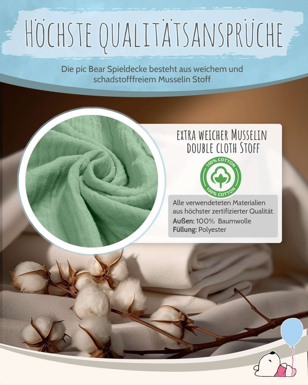 - 100% Musselin-Baumwolle: Die pic Bear Krabbeldecke bietet eine besonders weiche und hautfreundliche Oberfläche, ideal für empfindliche Kinderhaut und für stundenlangen Spielspaß.