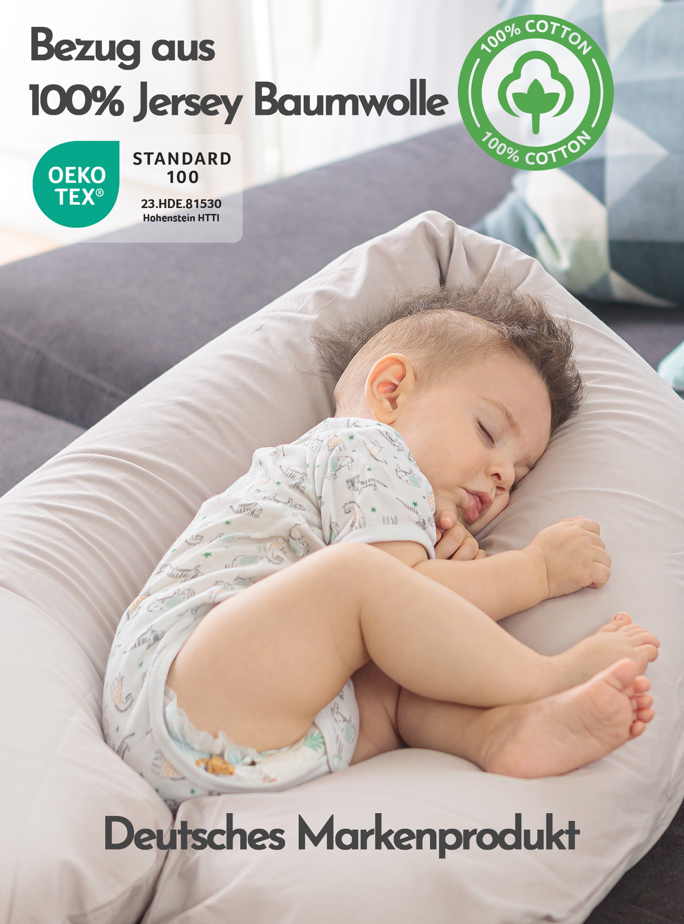 Das Inlett ist mit einem Reißverschluss versehen, sodass die Menge der Füllung individuell angepasst und der Bezug problemlos gewaschen werden kann. So kann eine möglichst lange Nutzungsdauer bei entsprechender Pflege garantiert werden und das Kissen vielleicht auch noch dem nächsten Kind eine Unterstützung in der ersten Lebensphase sein.