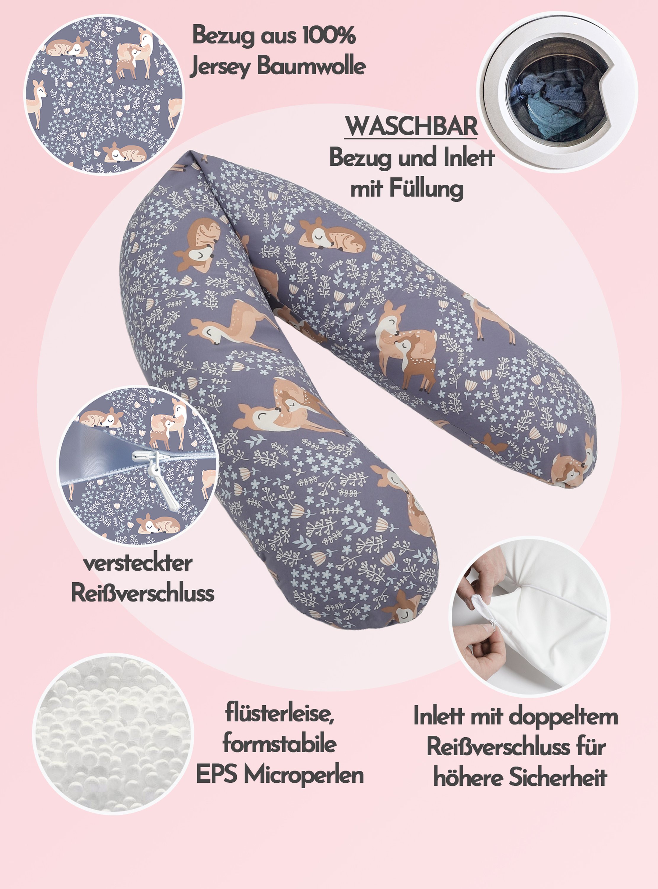 Das Inlett ist mit einem Reißverschluss versehen, sodass die Menge der Füllung individuell angepasst und der Bezug problemlos gewaschen werden kann. So kann eine möglichst lange Nutzungsdauer bei entsprechender Pflege garantiert werden und das Kissen vielleicht auch noch dem nächsten Kind eine Unterstützung in der ersten Lebensphase sein.