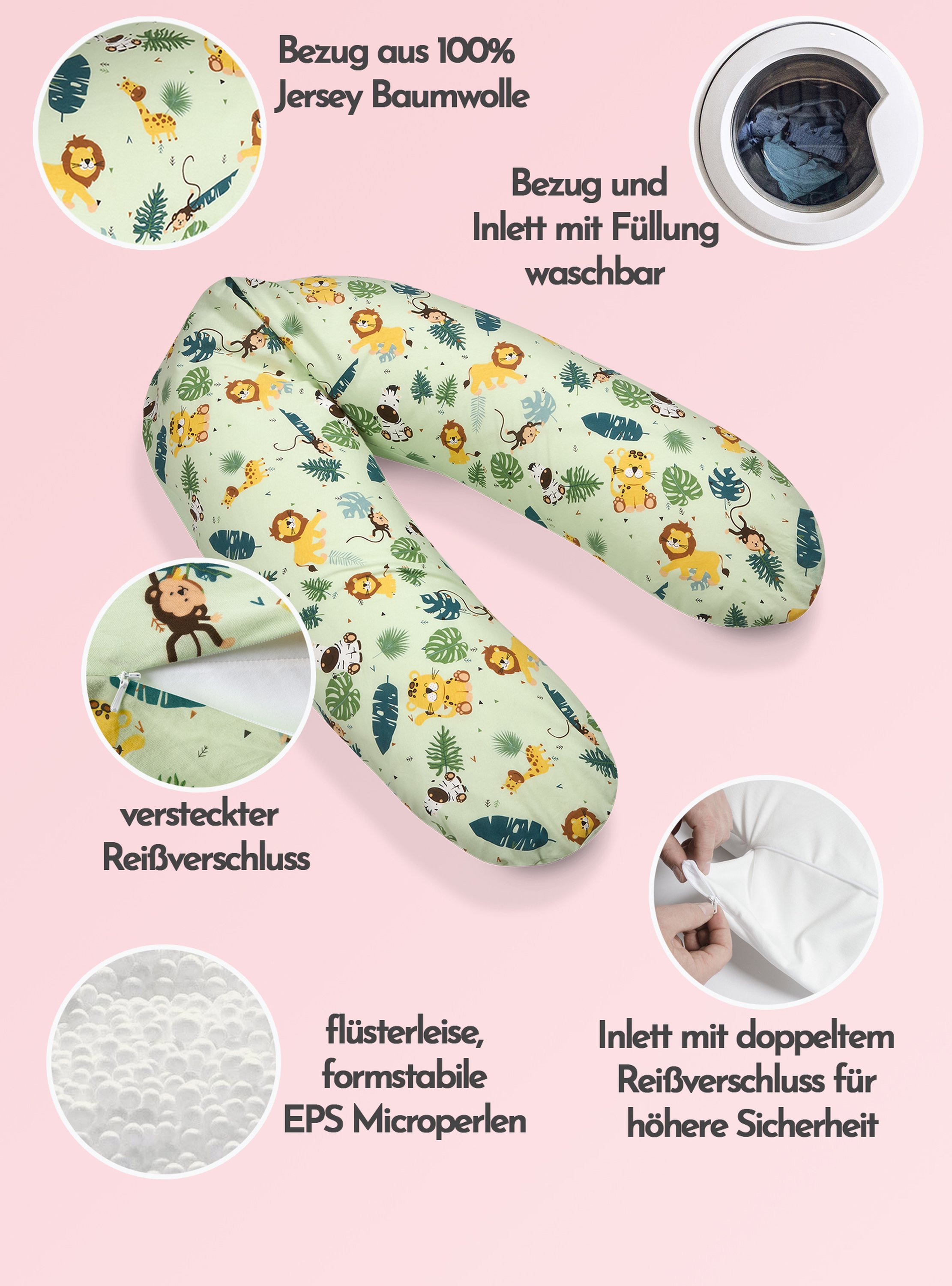 Das Inlett ist mit einem Reißverschluss versehen, sodass die Menge der Füllung individuell angepasst und der Bezug problemlos gewaschen werden kann. So kann eine möglichst lange Nutzungsdauer bei entsprechender Pflege garantiert werden und das Kissen vielleicht auch noch dem nächsten Kind eine Unterstützung in der ersten Lebensphase sein.