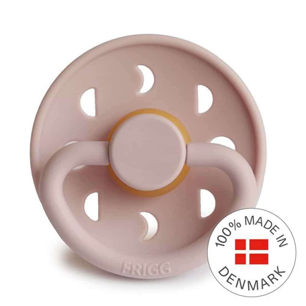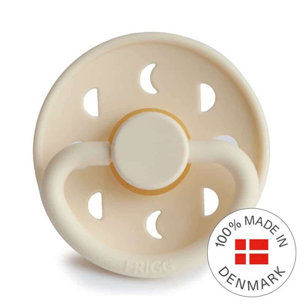 FRIGG Moon Phase ist ein Schnuller, welcher vom bewegenden Mond inspiriert ist. Die wechselnden Mondphasen spiegeln sich auf dem Kirschsauger Schild wider und fungieren als Luftlöcher, um die empfindliche Haut Deines Babys zu belüften und zu schützen. Die Mondphasen Inspiration setzt sich an dem halbmondfümigen Griff des Saugers fort.