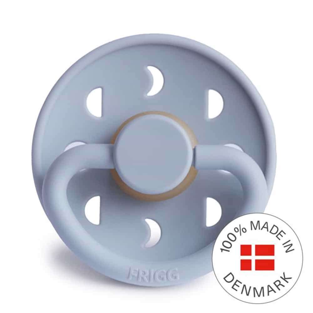 FRIGG Moon Phase ist ein Schnuller, welcher vom bewegenden Mond inspiriert ist. Die wechselnden Mondphasen spiegeln sich auf dem Kirschsauger Schild wider und fungieren als Luftlöcher, um die empfindliche Haut Deines Babys zu belüften und zu schützen. Die Mondphasen Inspiration setzt sich an dem halbmondfümigen Griff des Saugers fort.