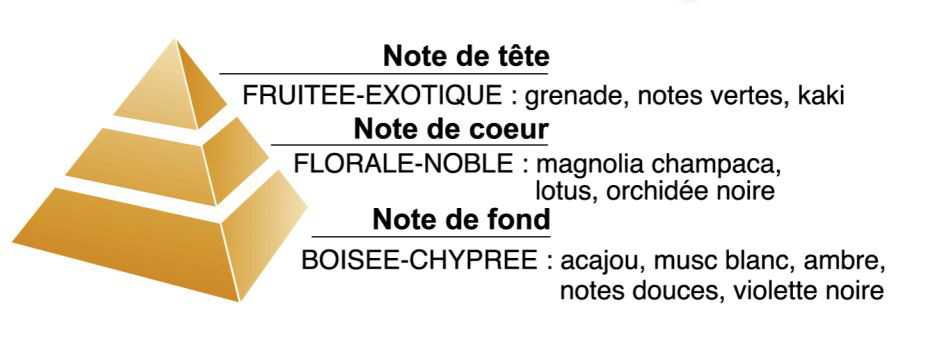 - Duftpyramide: Kopfnote aus Granate und Kaki, Herznote von Lotus und Orchidee, abgerundet mit einer Basisnote von weißem Moschus und Bernstein.